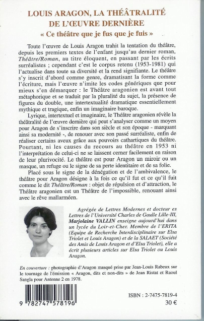 Marjolaine Vallin : Louis Aragon, la Théâtralité de l’œuvre dernière. « Ce théâtre que je fus que je fuis », L’Harmattan, 2005.