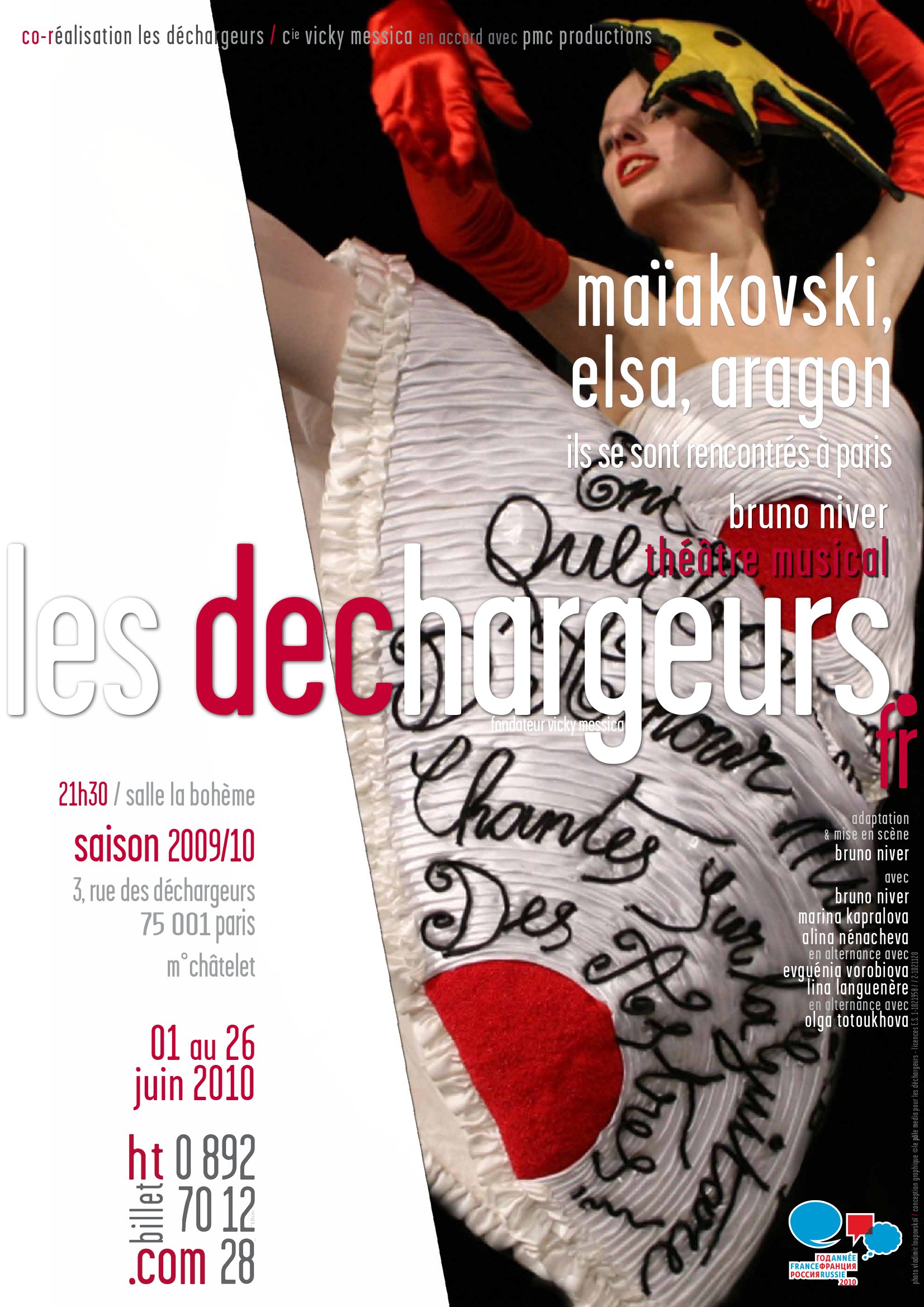 Tél. réservations : 0892 70 12 28 (0,34 €/mn) Maïakovski, Elsa, Aragon ils se sont rencontrés à Paris Du 1er au 26 juin 2010 Du mardi au samedi à 21h30 Salle La Bohème Durée : 1h10 Genre : théâtre musicalAdaptation et Mise en scène : Bruno Niver D’après : V. Maïakovski, L. Aragon, J. Ferrat, L. Ferré, F. Lemarque, romances et chansons russes des années 20…Avec : Bruno Niver (chant, poèmes), Marina Kapralova (comédienne), Alina Nénacheva en alternance avec Evguénia Vorobiova (pianistes), Lina Languenère en alternance avec Olga Totoukhova (danseuses) Paris-Moscou. Deux poètes, Maïakovski et Aragon. Deux sœurs, deux muses, Lili Brik et Elsa Triolet. Une histoire vraie que l’Histoire a oubliée.La rencontre de Maïakovski et Lili Brik, celle de Louis Aragon avec Elsa Triolet entre Paris et Moscou. Deux sœurs, deux muses, deux pays, la France et la Russie, deux langues et deux cultures auxquels ils ont laissé les plus fous des poèmes d’amour.