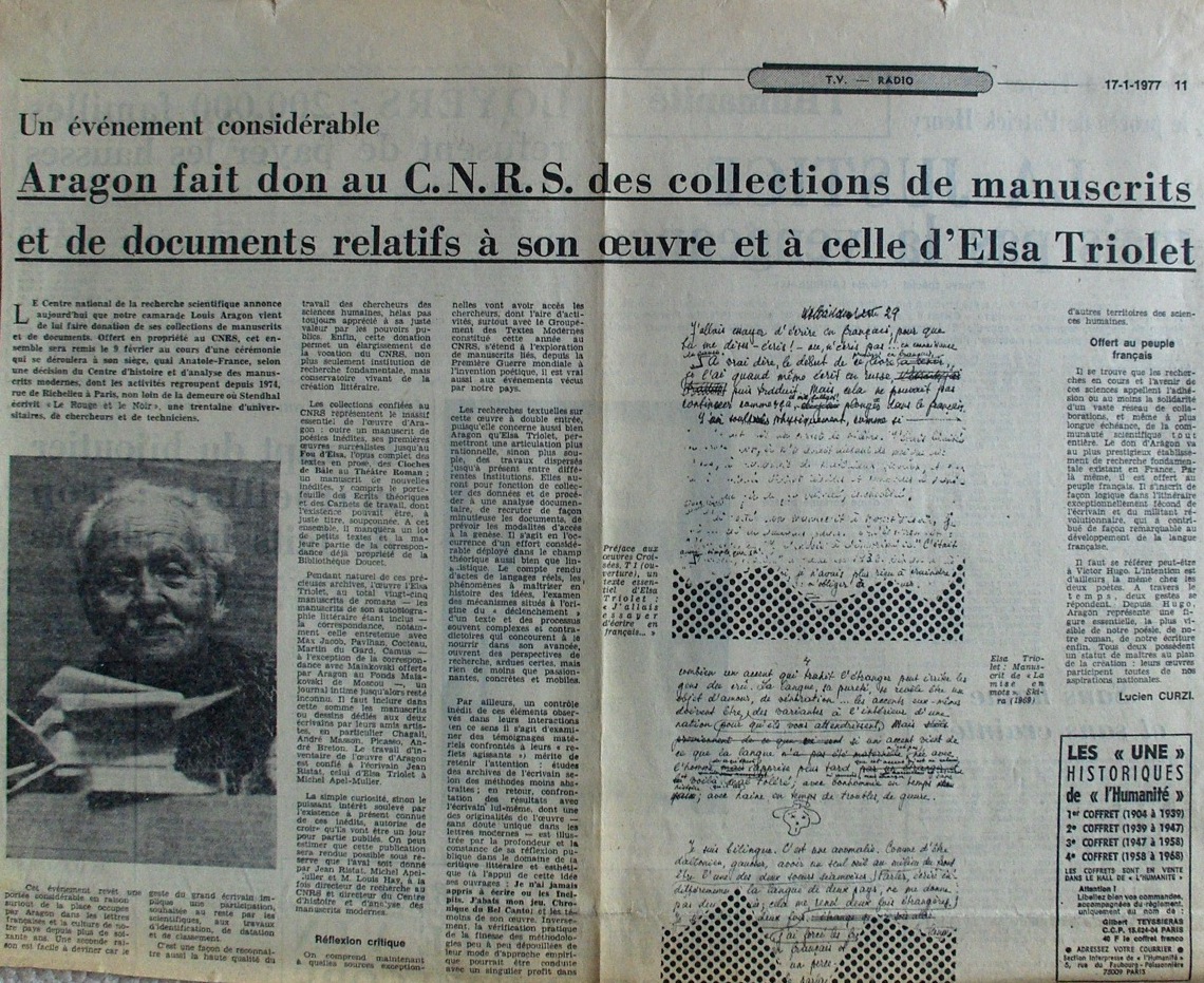 Fac similé d’une page de L’Humanité du 1er janvier 1977 (« Un événement considérable : Aragon fait don au CNRS des collections de manuscrits et de documents relatifs à son œuvre et à celle d’Elsa Triolet ») qui rappelle le rôle de Michel Apel-Muller dans le legs d’Aragon.