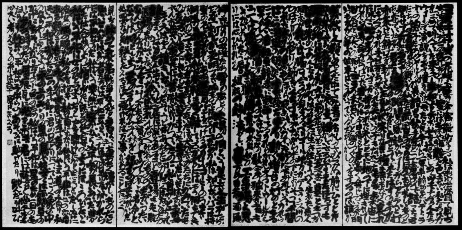 Je pense que la raison pour laquelle ces deux artistes ont atteint un tel état d’esprit se résume dans l’essai suivant de Gakyu : « Il n’est pas nécessaire de se demander ce qui est écrit, ni quel sens ont les personnages du texte. La qualité ou la valeur sont évaluées de manière définitive, instantanément, en un seul regard. Si nous les considérons comme des œuvres d’art pur et abstrait, nous apprécions la beauté de leurs lignes et leur composition. » (« L’expansion de la visualisation », Shogen n° 52, 1953).